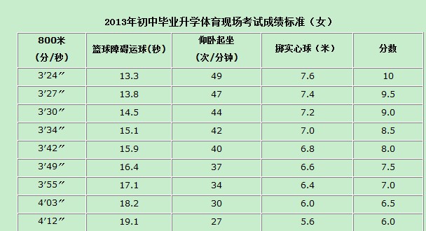 2013年初中毕业升学体育现场考试成绩标准(女)