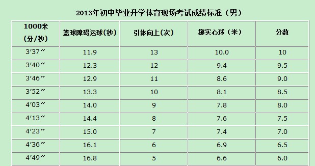 2013年初中毕业升学体育现场考试成绩标准(男)