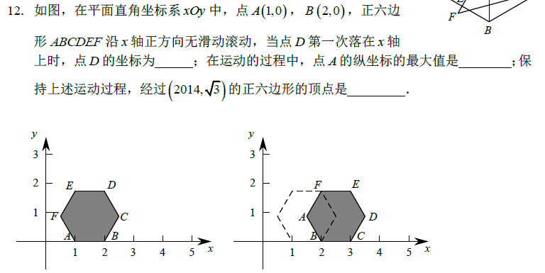 分析:本题其实没有太大难度,思考起来并不费劲,学生通过多画两次翻滚的过程很快可以掌握其规律。第二问问的是“运动过程中”,因此A点到x轴最大距离是线段AD的长度:2。前两问难度很小,第三问需要我们掌握翻滚过程的规律:每翻滚六次,点的位置与第一次完全一致。所以可以算出A点在(2011,0)时,各点位置与翻滚前一致。之后要注意的是本题的难点(陷阱)——存在两种情况下顶点位于题目所给目标点。