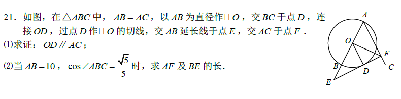 本题的第二问属于较简单的与锐角三角函数相结合的题目,提供锐角三角函数的题目可以把所有和该角相等的角都找出来,进而求出所有能求出的线段长度。本题连接AD之后,根据三线合一可知:BD=CD。在找出所有与∠ABC相等的角之后我们可以求出一系列的线段长度:AC(=AB)→BD→CD→CF→AF。在求出AF之后,要求出BE的长度,可以利用△EOD∽△EAF(需要设未知数)求出。