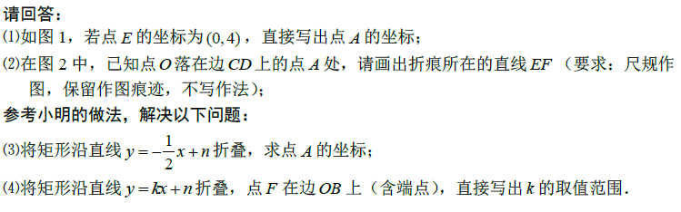 本题前三问均不难,只要学生模仿着小明的方法去进行就没有问题(其中作图题涉及到垂直平分线的作法)。第四问要求k的取值范围,由于题意中,与k有关的是tan∠AOD,即与Rt△AOD有关,所以我们求解k的取值范围可以转化为求DA的长度的范围。另外本题要审清题意——如“点A落在边CD上”,折痕与“边OB(含端点)或其延长线交于点F”。