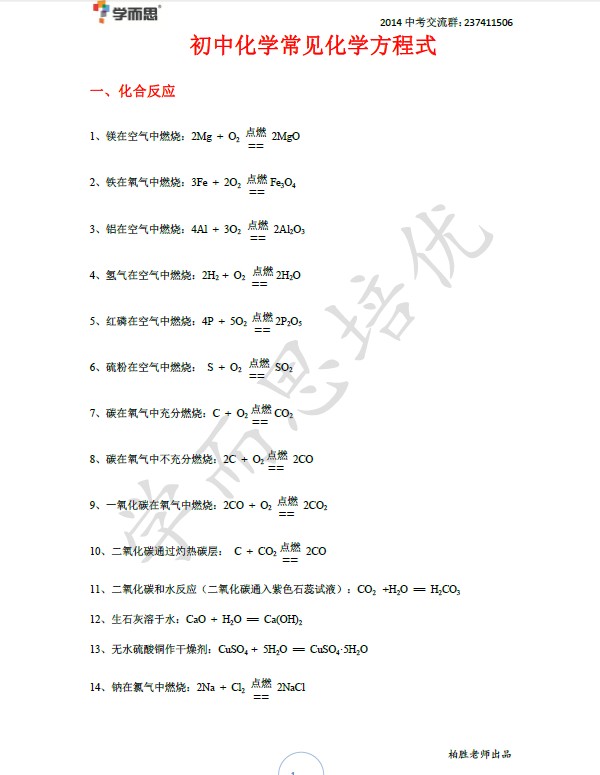 化学方程式就占到了分数值的14.3%,并且在其他知识点中也穿插了很多的化学方程式书写。按照考试范围来看,对与化学方程式的考察,一般分为两类,一类是书上出现过的化学方程式,这些事需要掌握的,占大多数,下面的归类里面的主要也是这些化学方程式;第二类是书上没有涉及,但是根据材料,学生可以灵活的推断出新的化学方程式书写,这类的考察范围比较广,很难总结,万变不离其宗,中考的试题源自于我们的书本,但肯定也会高出书本,只要我们熟练的掌握这些化学方程式,对于没有见过的可以根据材料和已经学过的推断出来。