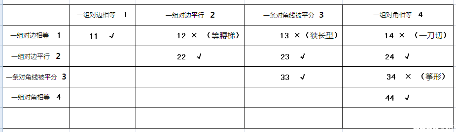 重庆中考网讯:平行四边形的判定,涉及因素较多,容易让孩子搞混,学而思老师整理了下面这个表。