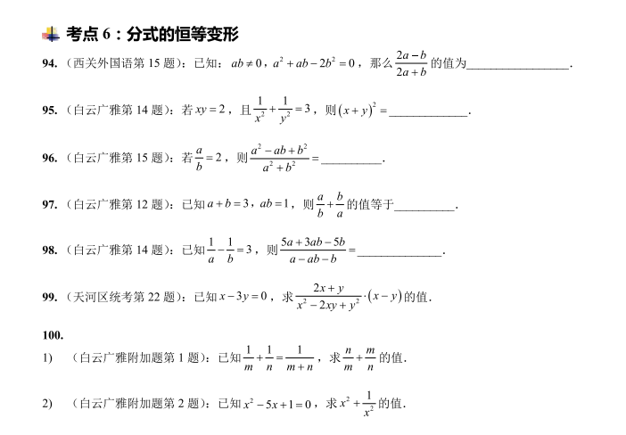 初中数学期末考试前必会100题试题下载(分卷):