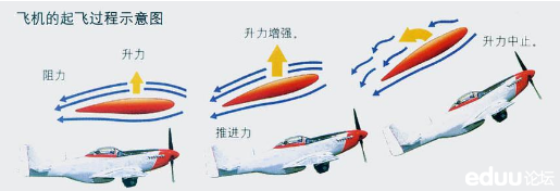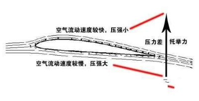 按照物理学的伯努利方程:同样是流过某个表面的流体,速度快的对这个表面产生的压强要小。因此就得出机翼上表面大气压强比下表面的要小的结论,这样子就产生了升力,升力达到一定程度飞机就可以离地而起。
