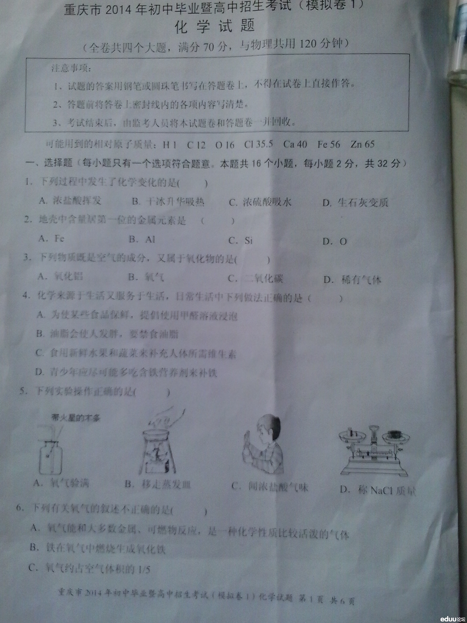重庆中考网讯 重庆八中初2014级中考一模化学试卷已出,具体如下。