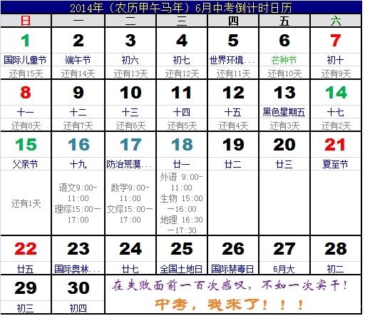 点这里下载:2014年长沙中考倒计时日历.xls [查看原帖参与讨论]