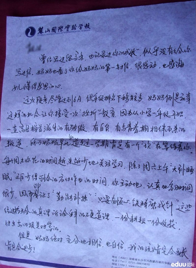 长沙中考网:此文是麓山国际一位妈妈在自己孩子出现问题后回的一封信,信中没有什么大道理,字里行间透露着妈妈对女儿的浓浓爱意以及良好的心态,孩子在看完这封信后短短的时间内就回到了年级前15,集团前20名的水平。