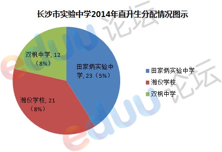 长沙市实验中学2014年对口直升生名额56人,分配给了田家炳实验中学、湘仪学校、双枫中学三所学校,其中田家炳实验中学人数最多,为23人,湘仪学校分配人数为21人,双枫中学人数为12人。