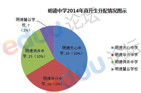 明德中学2014年对口直升生名额73人,分配给了明德天心、明德华兴、明德洞井、明德麓谷四所学校,明德天心人数最多为33人,明德华兴分配了30人,明德洞井分配了25人,还有明德麓谷学校分配了7人。其中明德天心和明德洞井仍属于对口支援范围,直升生名额仍为10%,明德华兴是托管学校,为5%。