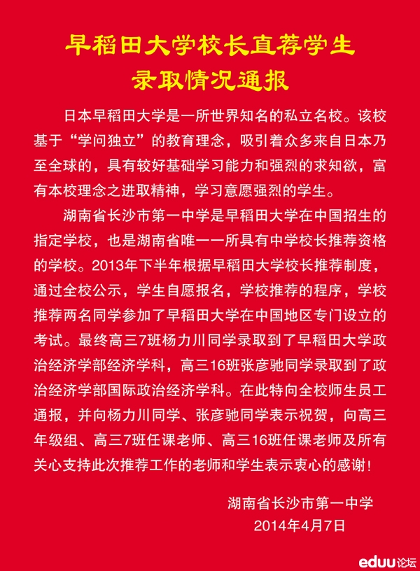 【查看原帖并参与讨论:长沙市一中2014届竞赛、推荐、自招优惠情况表】