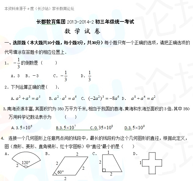 【查看原帖并参与讨论:长郡教育集团2013-2014-2期中考试初三数学试卷及答案】
