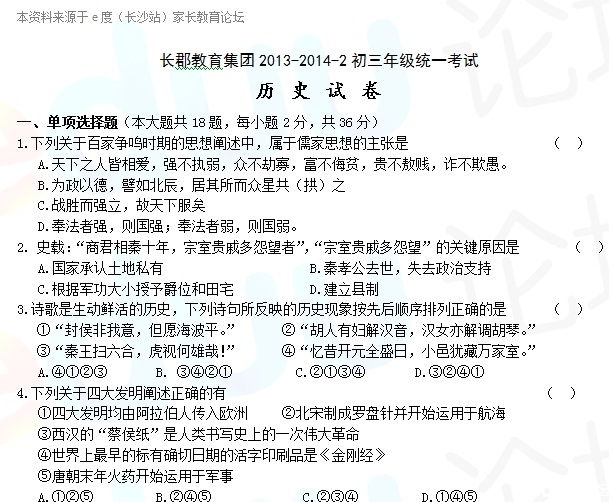 【查看原帖并参与讨论:长郡教育集团2013-2014-2期中考试初三历史试卷及答案】