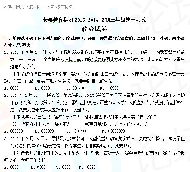 【查看原帖并参与讨论:长郡教育集团2013-2014-2期中考试初三政治试卷及�】
