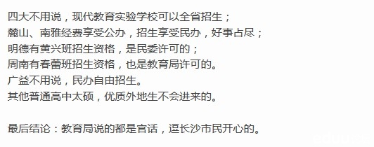 景木wind:也就是说,长沙稍微好一点的学校,都是允许招外地生的。然后搞一些差学校,外地生都不愿意来的学校,说是不允许招生,演戏给我们看。
