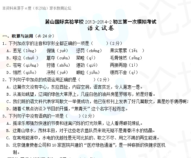 试题下载入口2:麓山国际实验学校2013-2014-2初三第一次模拟考试语文试卷.doc