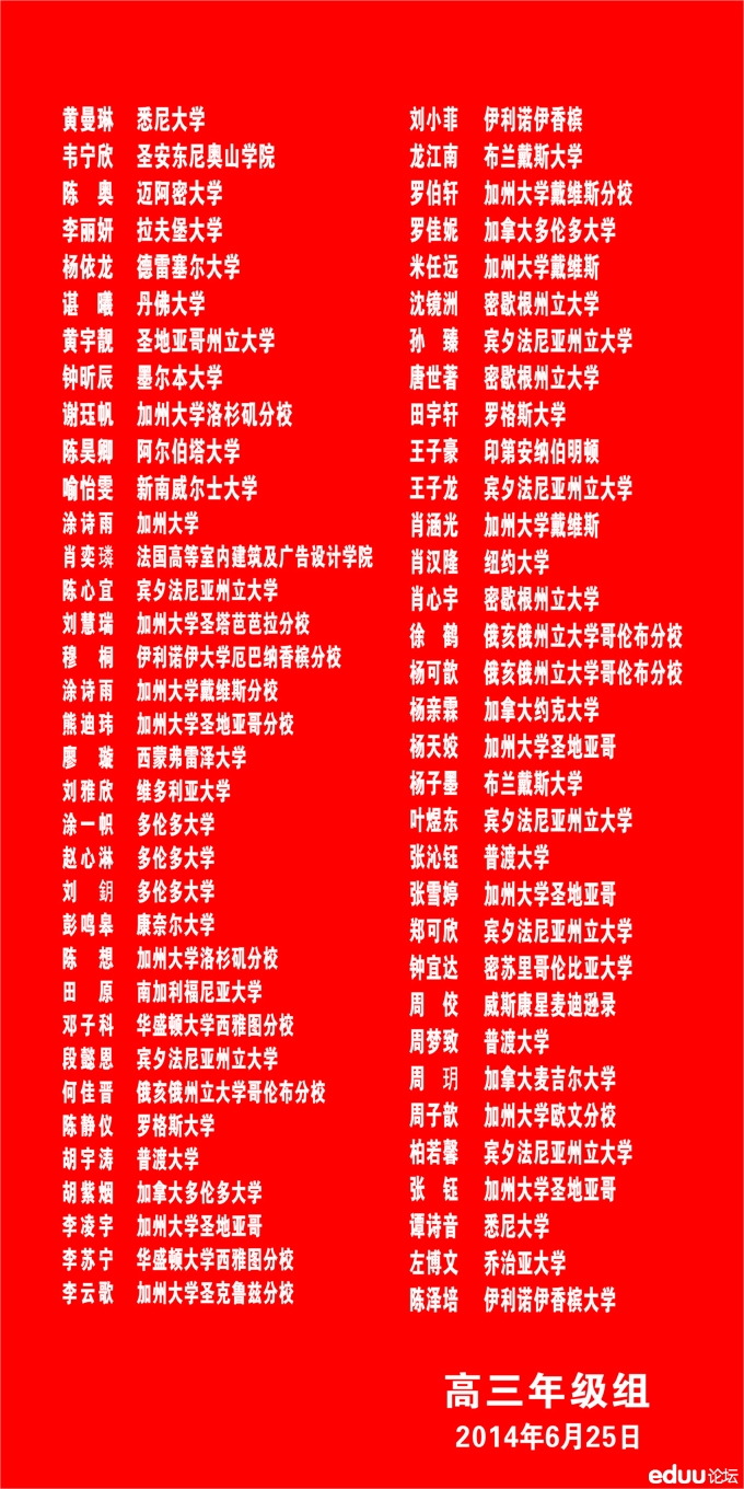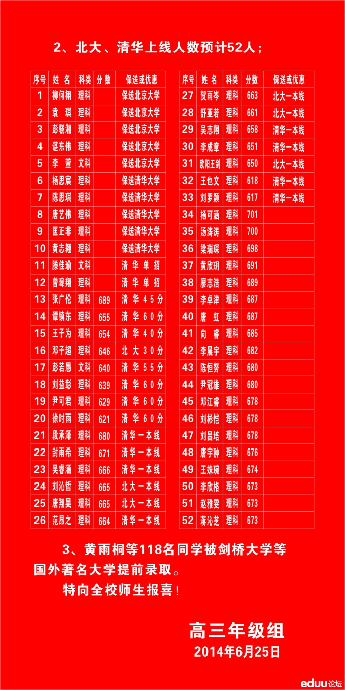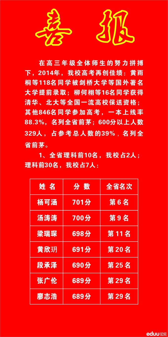 雅礼中学2014年高考喜报 2014-06-26 09:47:45iman13 长沙中考网讯 长沙各中学高考成绩已出,高考成绩影响到中考生对学校的选择,以下是雅礼中学2014年高考喜报。 【查看原帖并参与讨论:雅礼中学2014年高考喜报】