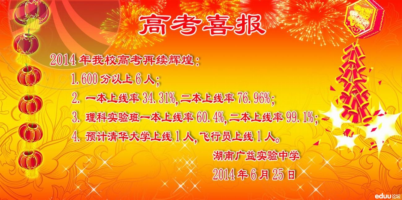 2014年湖南广益实验中学高考喜报 2014-06-26 14:15:24长江之水 长沙中考网讯 湖南广益实验中学2014年高考喜报已出,具体如下。 【查看原帖并参与讨论:湖南广益实验中学2014年高考喜报】