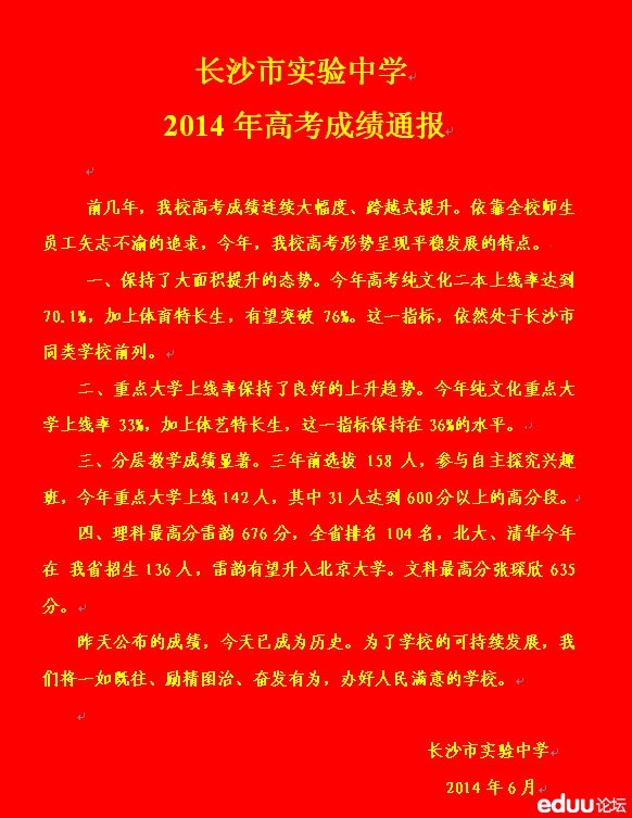 2014年长沙市实验中学高考喜报 2014-06-26 14:16:12e度大本营_辣辣 长沙中考网讯 长沙市实验中学2014年高考喜报已出,具体如下。 【查看原帖并参与讨论:长沙市实验中学2014年高考喜报】