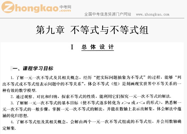 第九章 不等式与不等式组 2014-03-13 09:41:19中考网编辑 点击免费领取中考核心考点资料! 请下载附件: 《七年级下册数学人教版教师用书电子教案 第九章 不等式与不等式组》 (本地下载在线阅读)