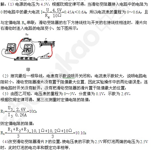 点评:本题考查了电流表和滑动变阻器的连接、电路现象的判断、电压表的读数、欧姆定律的应用等,关键是知道为减小误差测定值电阻的阻值时应多次测量求平均值和知道额定电压下灯泡的实际功率与额定功率相等.