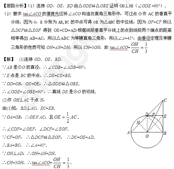 【方法指导】(1)证切线共有两种类型题①已知半径则证垂直.在证垂直时要充分运用题目中已有的直角.②不知半径则作垂直证半径.(2)要求一个锐角的三角函数值首先要把这个角构造在直角三角形中或把与这个角相等的角构造在直角三角形中.解决此类问题要注意三角形中位线、线段垂直平分线及三角形全等(相似)等知识的应用.