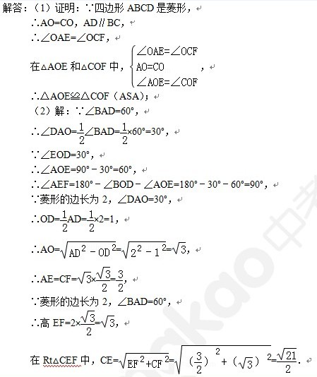 (2)根据菱形的对角线平分一组对角求出∠DAO=30°,然后求出∠AEF=90°,然后求出AO的长,再求出EF的长,然后在Rt△CEF中,利用勾股定理列式计算即可得解.