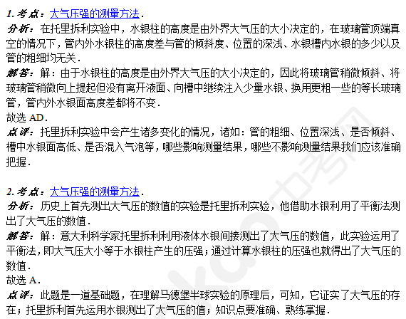 中考物理天天练试题及解析:大气压强的测量(2月8日)(2)