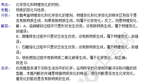 中考化学天天练试题及答案:化学变化和物理变化的判别(6月8日)(2)