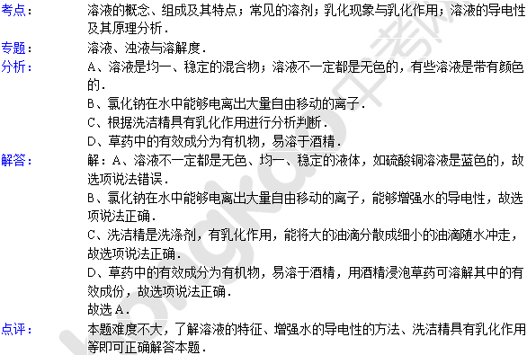 中考化学天天练试题及解析:溶液的导电性(8月11日)(2)