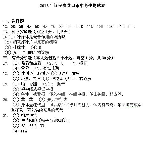 2016年辽宁营口中考生物试题答案 2016-05-15 13:48:29中考小编 点击免费领取中考核心考点资料! 2016年辽宁营口中考生物试题答案 编辑推荐: 2015年全国各地中考各科试题及答案大全