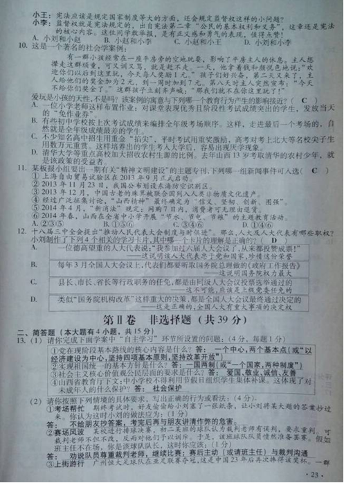2014年山西大同中考政治试题及答案(扫描版)