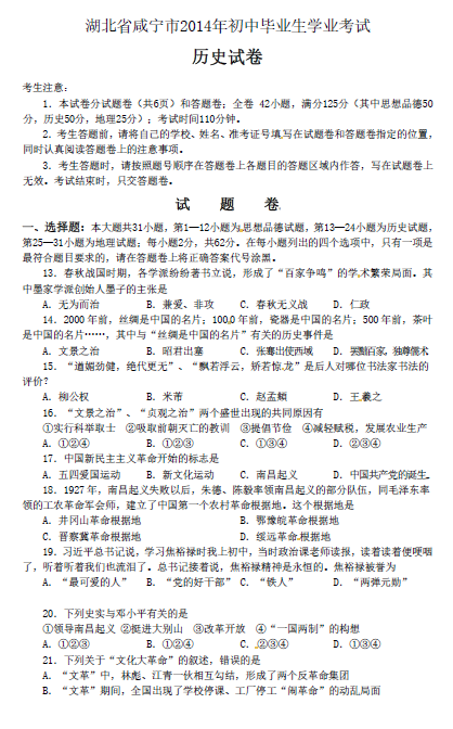 2014年湖北咸宁中考历史真题(图片版)