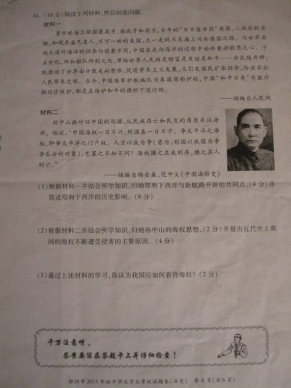 2013年湖南邵阳中考历史真题(图片版)(6)
