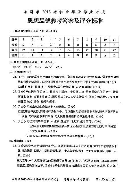 2013年湖南永州中考政治真题答案(图片版)