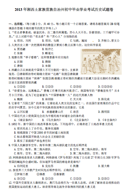 2013年湖南湘西中考历史真题(图片版)