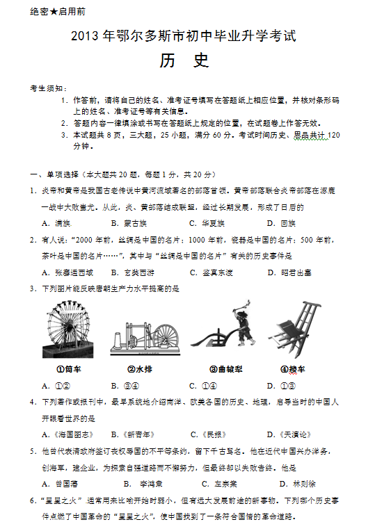 2013年内蒙古鄂尔多斯中考历史试题(图片版)
