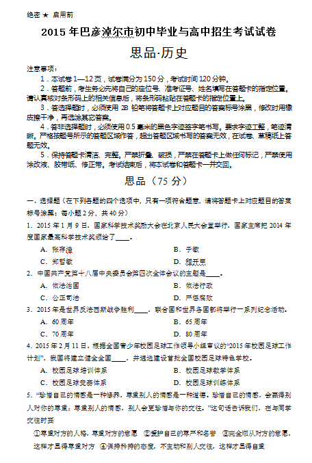2015年内蒙古巴彦淖尔中考政治试题(图片版)