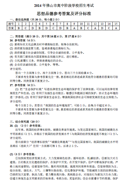 2014年广东佛山中考政治真题答案(图片版)