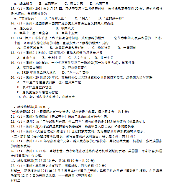 2014年福建漳州中考历史试题(图片版)(2)