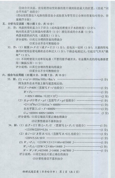 2013年黑龙江齐齐哈尔中考物理试题答案(2)