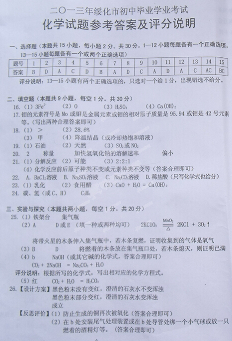 2013年黑龙江绥化中考化学试题答案(图片版)
