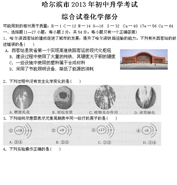 2013年黑龙江哈尔滨中考化学试题(图片版)