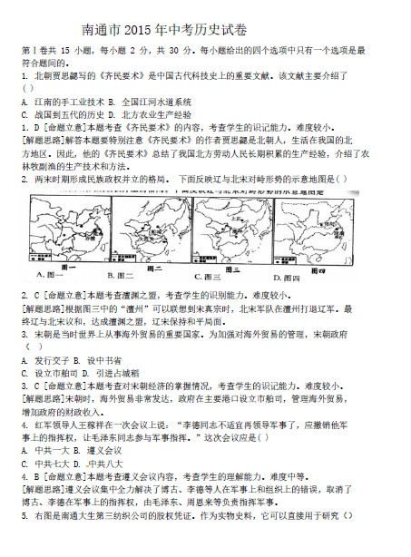 2015年江苏南通中考历史试题