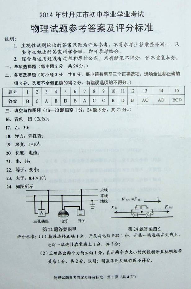 2014年黑龙江牡丹江中考物理试题答案(图片版)