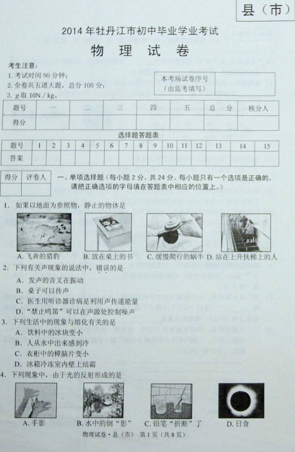 2014年黑龙江牡丹江中考物理试题(图片版)