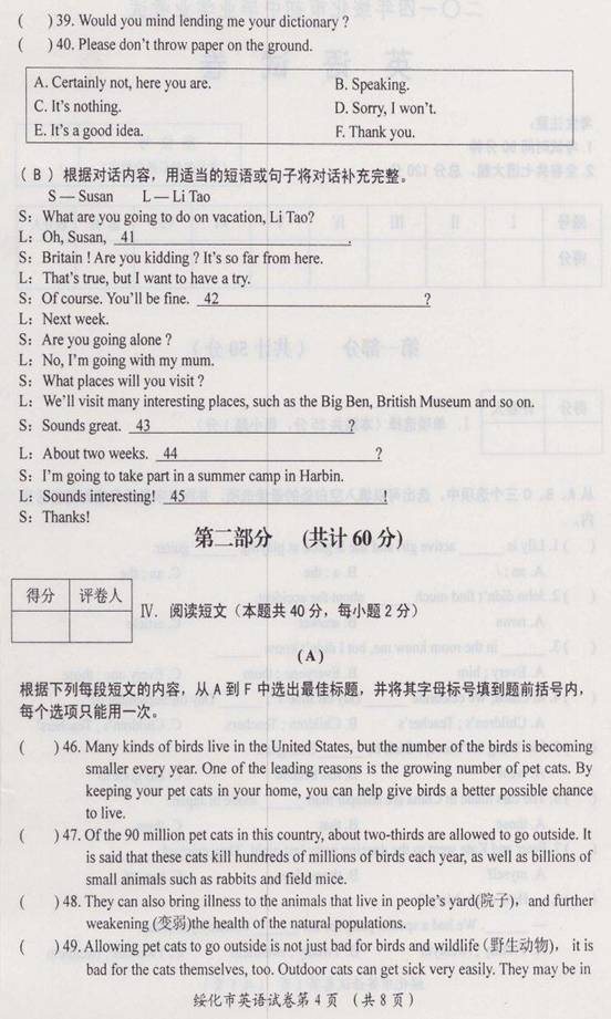 2014年黑龙江绥化中考英语试题(图片版)(4)