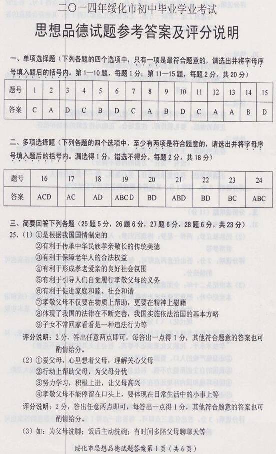 2014年黑龙江绥化中考思想品德试题答案(图片版)