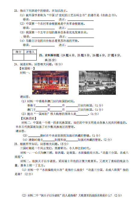 2014年黑龙江七台河中考历史试题(图片版)(3)