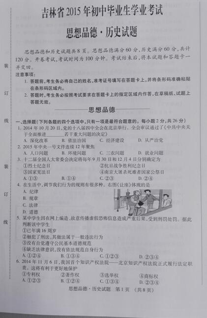 2015年吉林吉林中考政治真题(图片版)